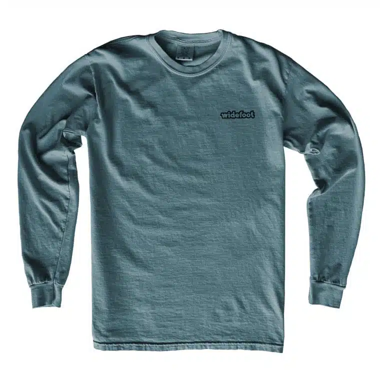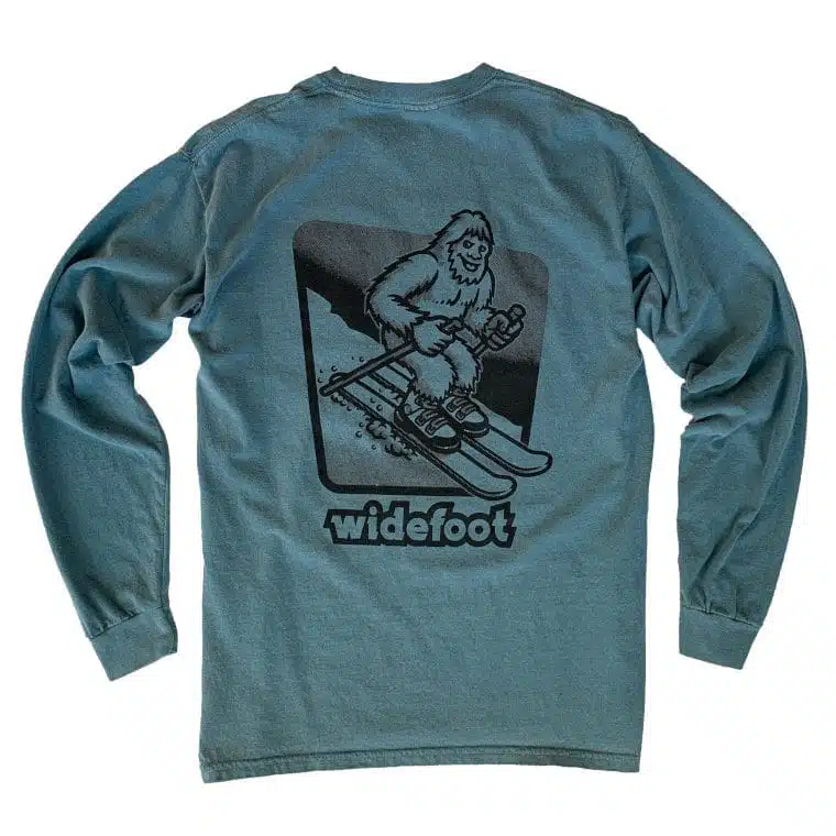 Comfy long sleeve t-shirts featuring our Vagabond mascot hitting the slopes. Large graphic print on back of shirt, and Widefoot logotype on the left side chest.